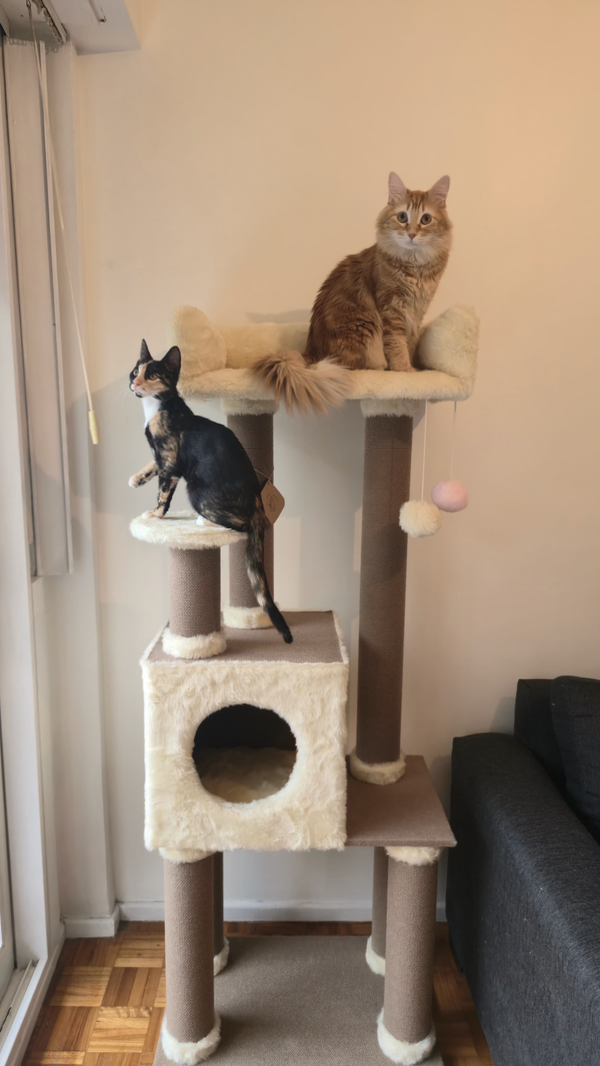 El Arbol Con Guarida y Diván en altura es un mueble que lo tiene TODO. Super firme y robusto, en este gimnasio los michis trepan, elongan y ejercitan. Duermen sus siestas muy cómodos ya que la guarida y el diván disponen de espacios amplios para cualquier tamaño de gato. Cuenta con mucho lugar para el rascado en dos posiciones de acuerdo a la preferencia de ellos: horizontal y vertical. Incluso hay un pilar de 90 cm que sirve para elongar y rascar en simultáneo. Al medir 1,60 pueden observar todo desde las alturas (algo que a ellos les encanta).